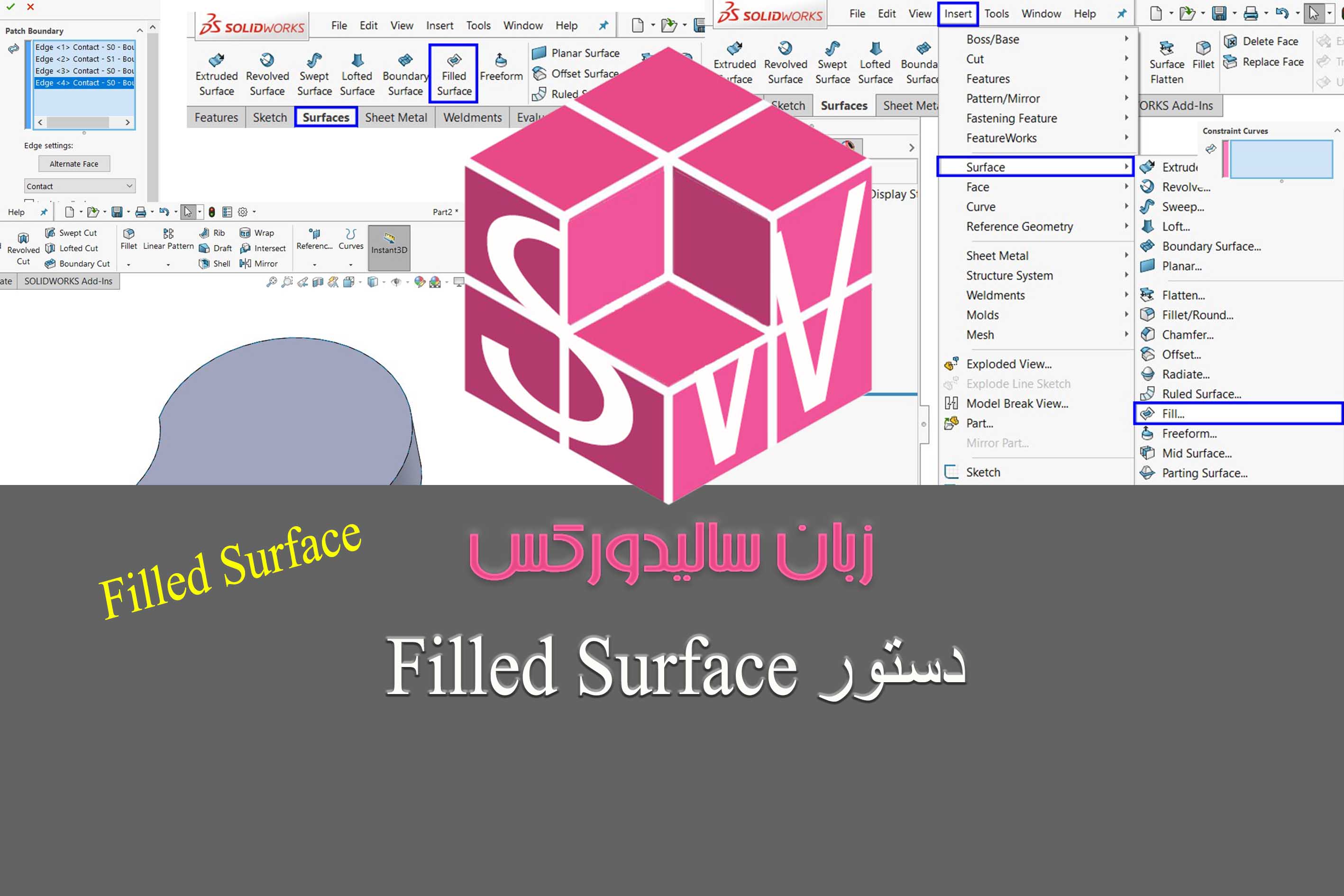 این پست ادامهای بر روند آموزش کامل و ریز به ریز دستورات محیط Surface نرمافزار Solidworks میباشد. در این مقاله و در تکمیل مقالهی "آموزش دستورات محیط Surface بخش اول" و "آموزش دستورات محیط Surface بخش دوم" به سایر دستورات موجود در نوارابزار این محیط خواهیم رسید و خواهیم دید که دستور Filled Surface چگونه کار میکنند و چه نکات و چالشهایی خواهند داشت.